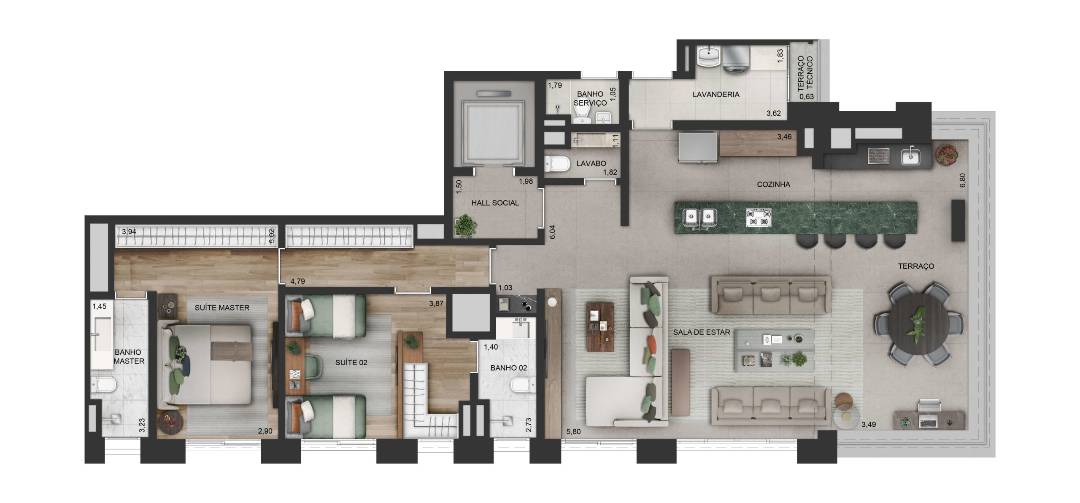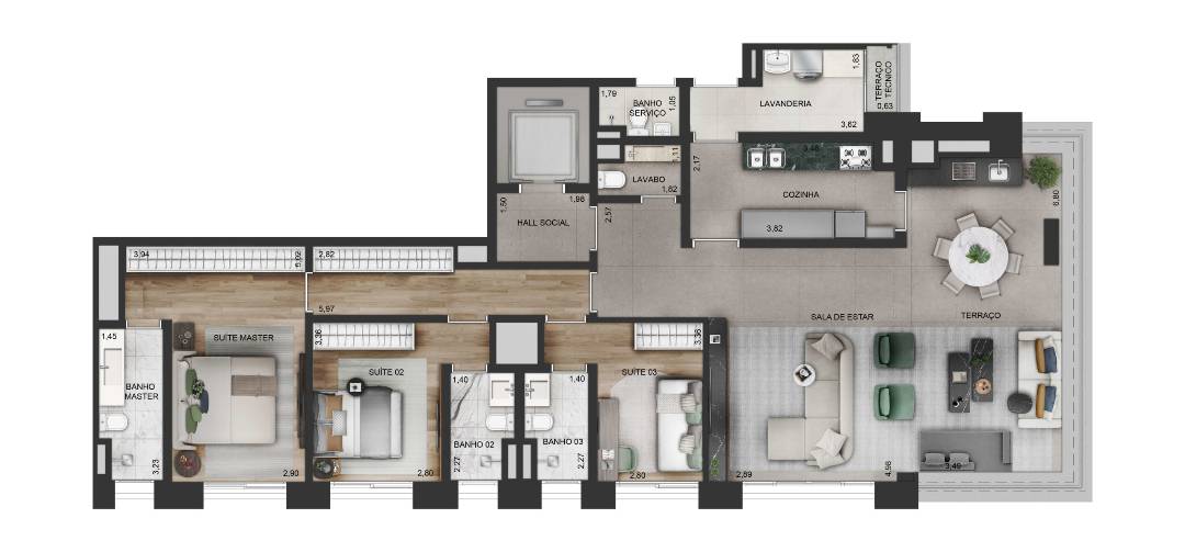 O apartamento de 155m² conta com hall social privativo, sala de estar e tv, terraço gourmet com acesso ao living, lavabo, cozinha adaptável com planta aberta ou fechada e com acesso ao terraço, área de serviço, despensa e banheiro de serviço. São três suítes maravilhosas, com infraestrutura para suíte master.