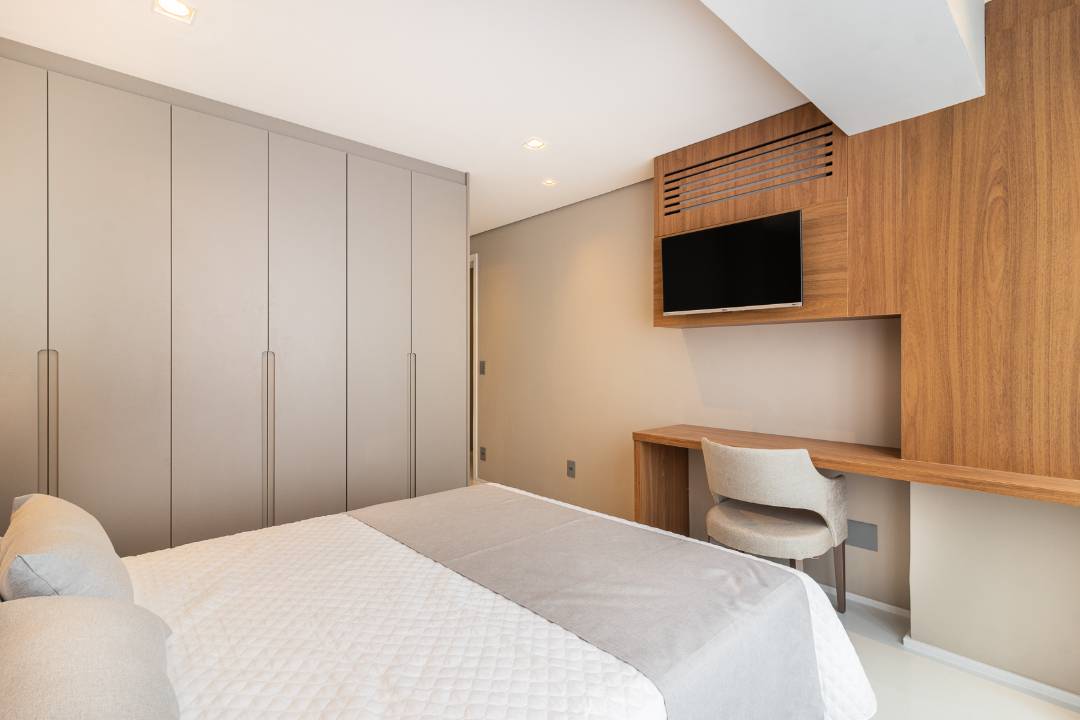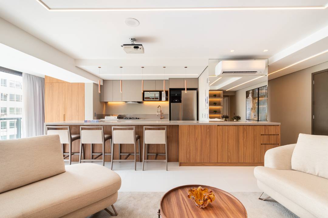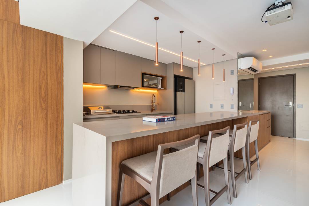 Duplex com união de charme e modernidade, mobiliado e decorado com design minimalista, utilizando metais cobre e revestimentos em cimento queimado. Conta com amplo living integrado com a